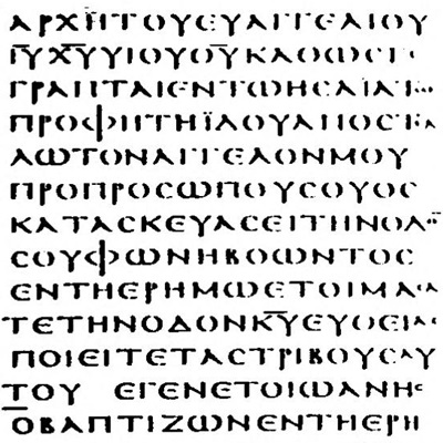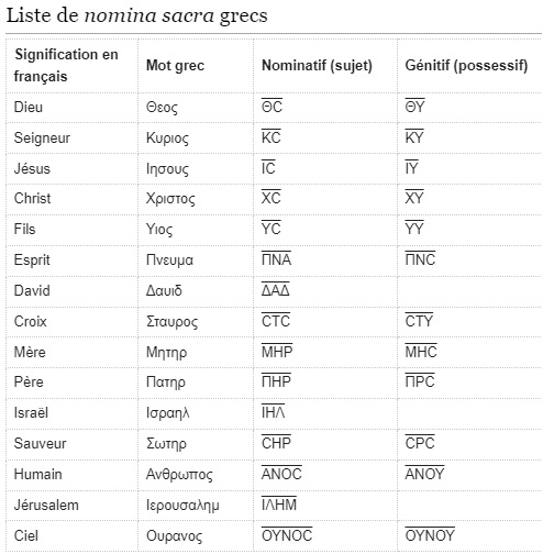 On appelle nomina sacra la pratique qui consiste, dans les manuscrits anciens du Nouveau Testament, à contracter certains mots théologiquement signifiants, en conservant de ces termes la première et la dernière lettre – IΗCΟYC devient IC, XPICTOC devient XC, etc1. – que l’on surmonte ensuite d’un trait. On retrouvera plus tard ces abréviations autour des figures saintes, dans l’art chrétien de l’icône.